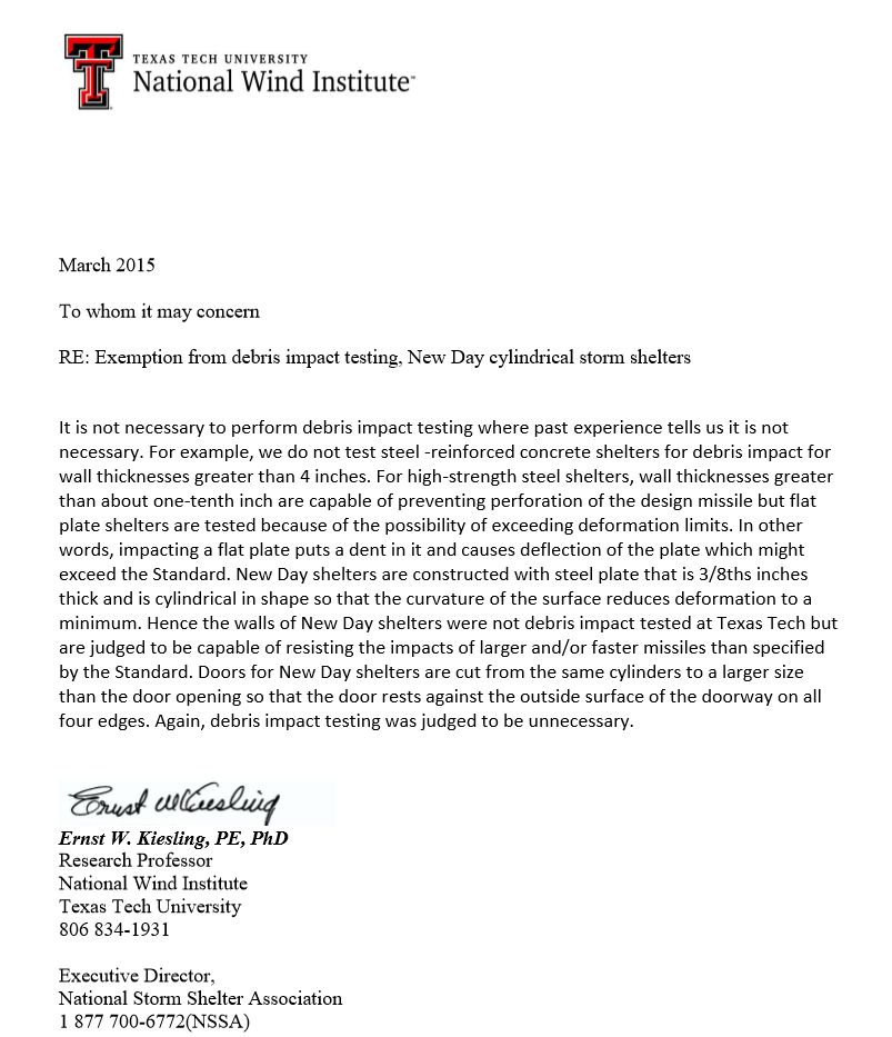 Forever there were no standards for storm cellars! At the end of last century, FEMA offered guidelines and then in this century, National Storm Shelter Association produced an actual Standard. This NSSA Standard was then adopted by International Code Council. The New Day Tornado Shelter was engineered in accordance with this Standard for "near-absolute" protection in high-wind events.